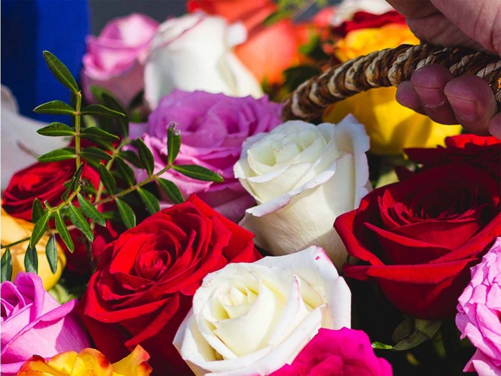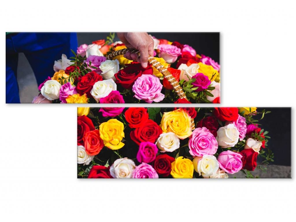 Krásné barevné růže v proutěném koši. Jistě téměř ucítíte omamnou vůni květů. Dvoudílný obraz pro oživení vašeho pokoje.