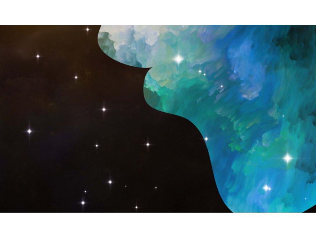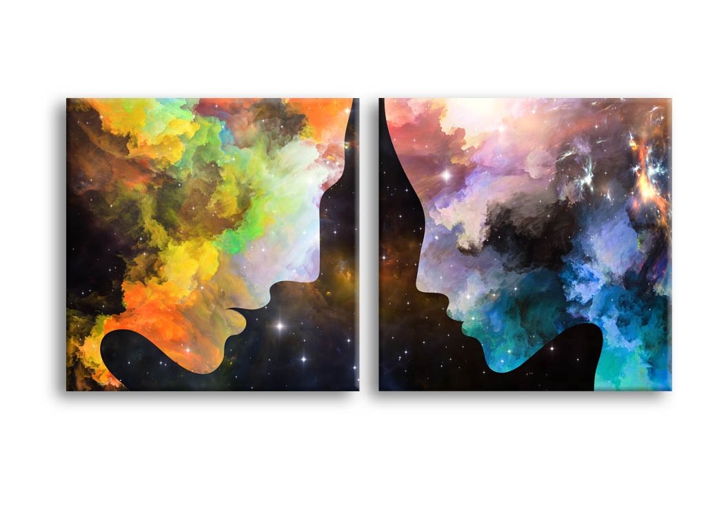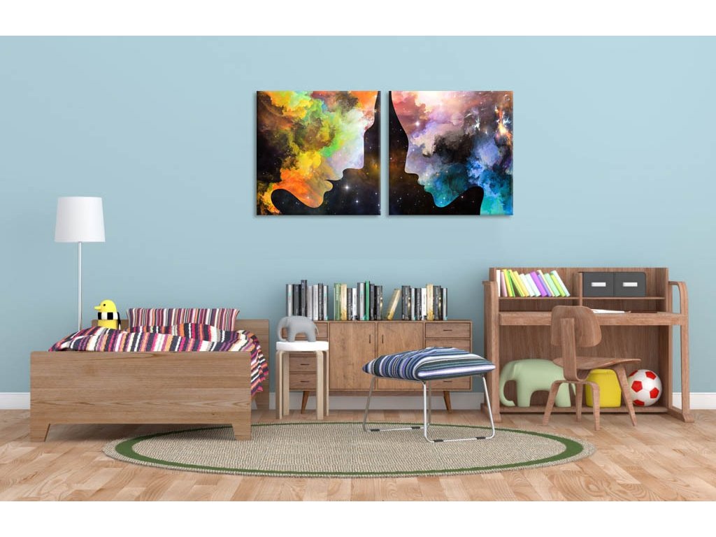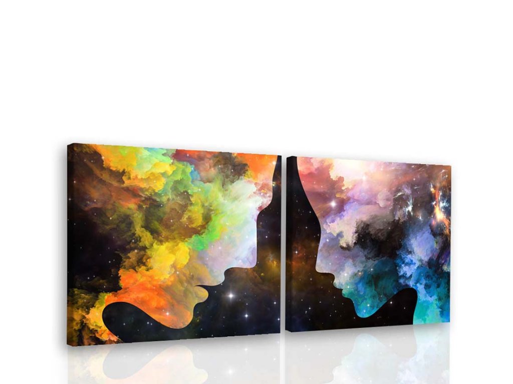 Siluety dvou hlav proti sobě v mlžném oparu. Abstraktní obraz, který doslova hýří barvami, které však navodí uvolněnou a odpočinkovou náladu.
