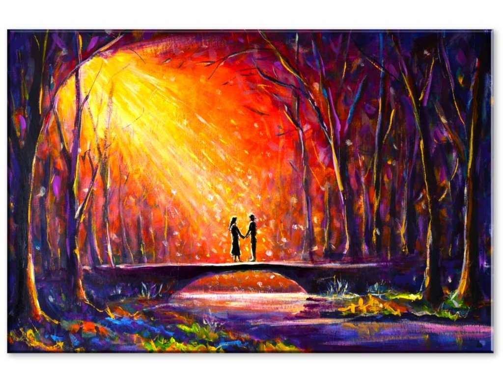 Reprodukce obrazu milenců na mostě při západu slunce navodí příjemnou atmosféru. Obraz vhodný k pověšení nejen do ložnice.