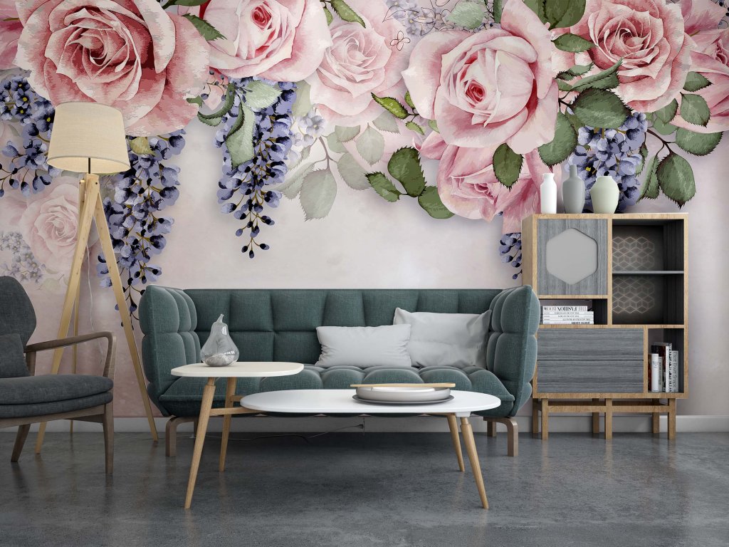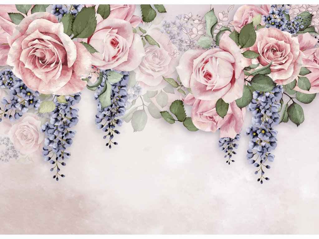 Květy modré vistárie a růžové růže vypadají spolu perfektně. Vliesová tapeta s motivem těchto květů dodá styl vašemu bydlení.