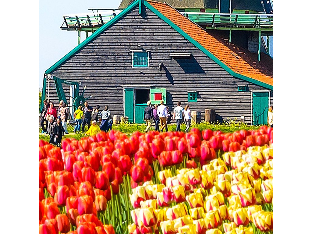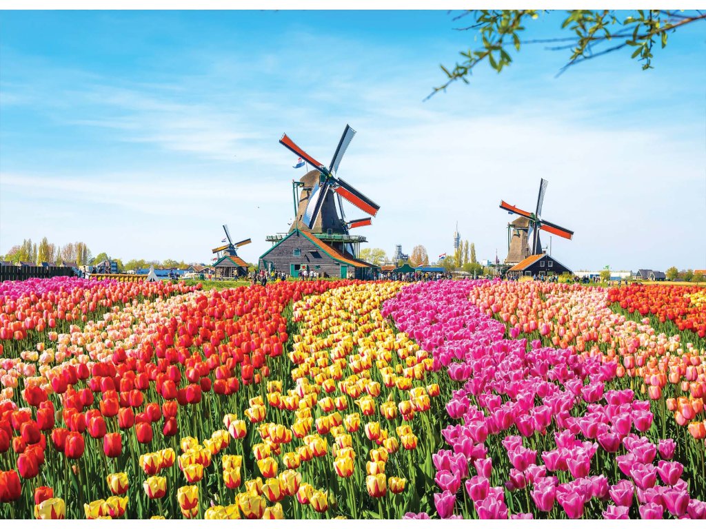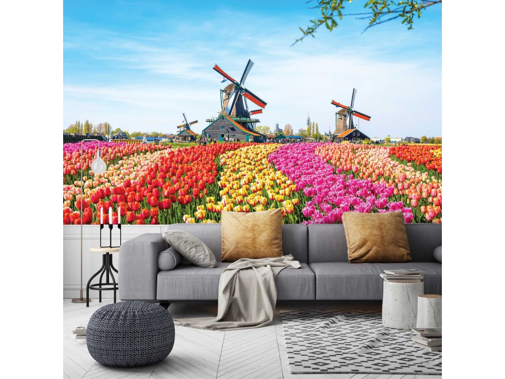 Mlýny v Nizozemsku obklopené různorodými tulipány. Vytyčující se barvy vlajky Nizozemska se točí pošťuchujícím větrem v zachycené fotce. Zdá se že výstava těch nejkrásnějších tulipánů se může hodit i k Vám do pokoje.